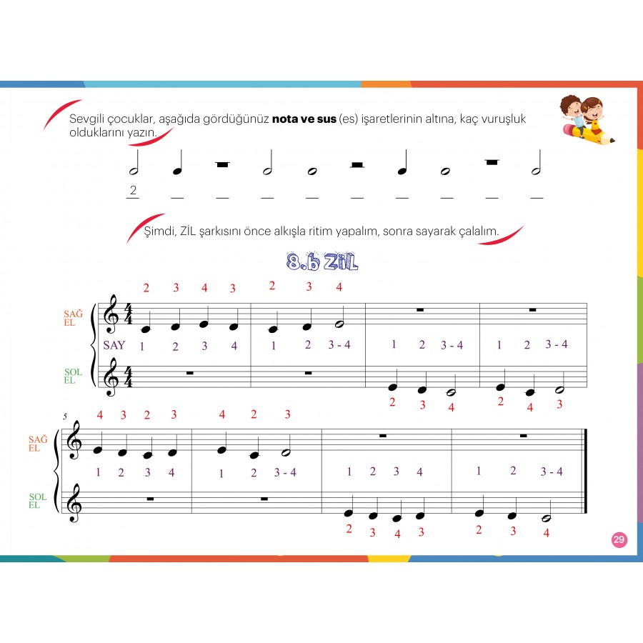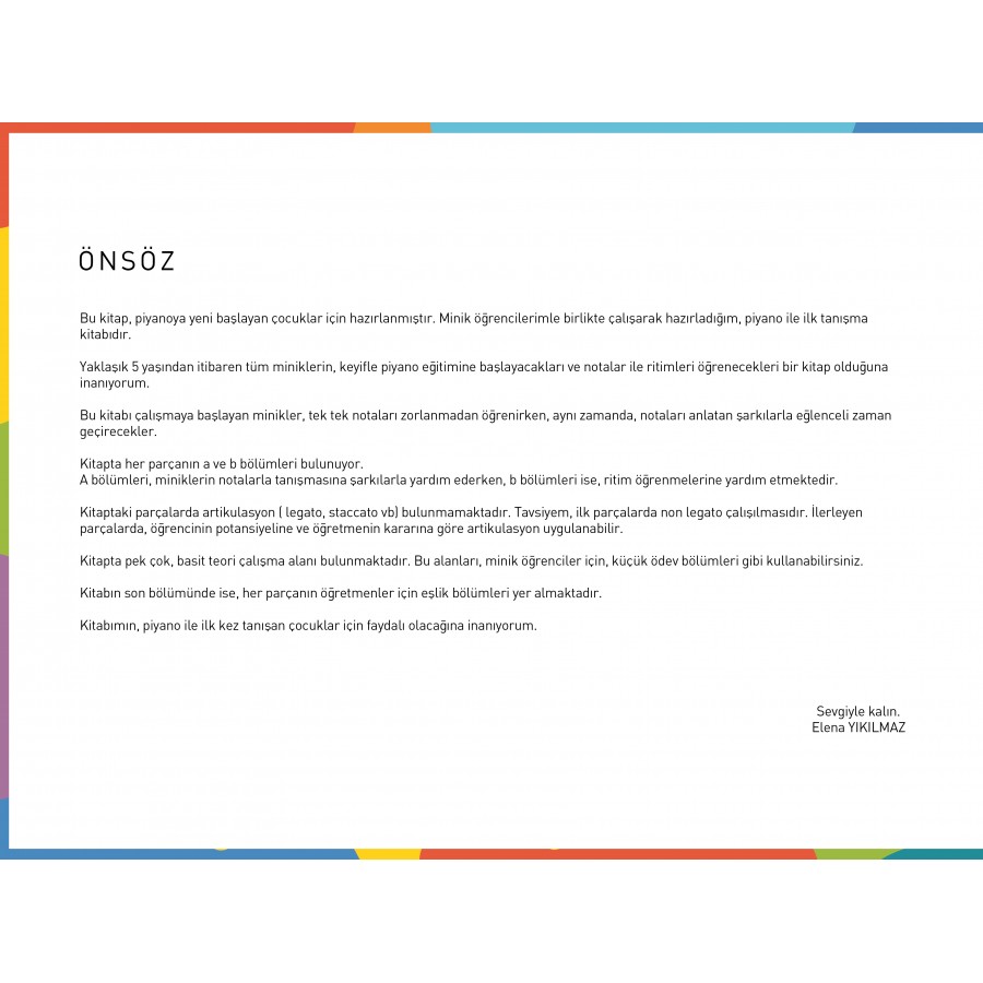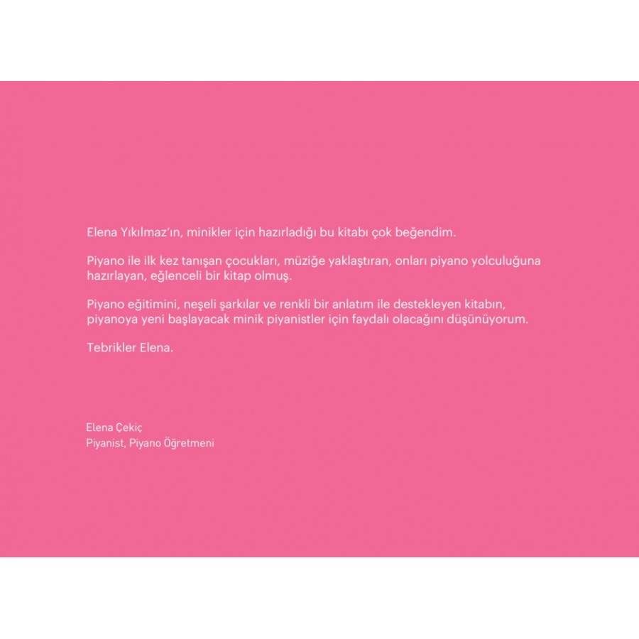 Yaklaşık 5 yaşından itibaren tüm miniklerin, keyifle piyano eğitimine başlayacakları ve notalar ile ritimleri öğrenecekleri bir kitap olduğuna inanıyorum.